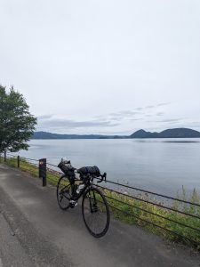 嵐をホテルでやり過ごした後、洞爺湖に虹が!いざルサンへ向かうも、60kmずーっと上り坂…。8kgの荷物を背負っての激坂ルートは、この旅一番の体力修行でした。
